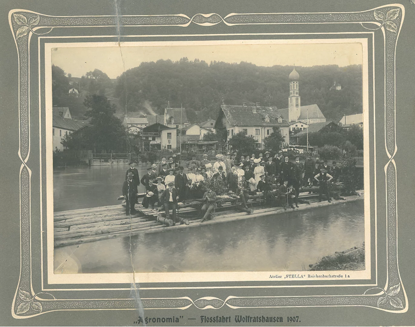 bei dieser Fotografie handelt es sich um die älteste Aufnahme einer Vergnügungsfloßfahrt, die sich in unserem Stadtarchiv befindet. Mit 112 Jahren weist sie ein stolzes Alter auf, dass man ihr leider auch etwas ansieht. Bei den abgelichteten Gästen der „Agronomia“ dürfte es sich wohl um eine landwirtschaftliche Studentenverbindung handeln. Die bereits routiniert wirkende Inszenierung der Fotografie lässt vermuten, dass dies wohl bei weitem nicht die erste Floßfahrt dieser Art bei uns gewesen sein dürfte. Ob die anwesenden Damen und Herren aber auch ein Grund für das 1912 erfolgte Verbot des Nacktbadens bei Floßfahrten waren, wird sich leider wohl nicht mehr klären lassen.