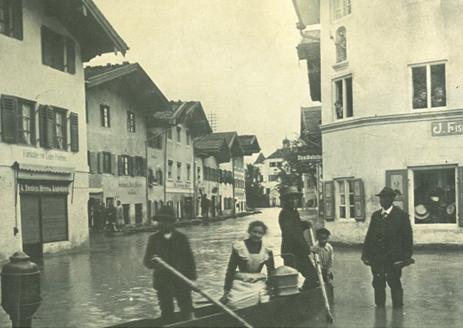 Zum Thema Alpenfluss habe ich Ihnen heute eine historische Fotografie aus dem Jahre 1910 herausgesucht. Es zeigt den Blick ungefähr von der Höhe Schwankl-Eck auf den oberen Obermarkt und die Littig-Villa. Wie Sie sehen können, ist der Wasserstand bedrohlich, der Wasserpegel lag damals 60 cm über dem Straßenniveau! Solche Hochwasser waren damals jedoch gar nicht so selten, was man unter anderem auch an den angemalten Höchstständen am Buckhaus in der Johannisgasse sehen kann. Erst die Loisachregulierung in den 1920er Jahren schaffte hier Verbesserungen, zum Abschluss insbesondere im Bereich Weidach kam es aber erst in den 1950er Jahren.
