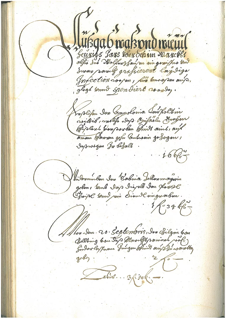 Einen Eindruck kann man dennoch auch heute noch bekommen, durch eine Quelle, bei der man es nicht erwarten würde. Denn die Kammerrechnung des Marktes von 1634 führt einen eigenen Punkt über die Kosten für das „grahsierent leydige Infectionwesen“. Dabei handelt es sich um Kosten, die für die Beerdigung von Pesttoten an verschiedenste Leute gezahlt werden mussten. Und die Bezahlung für diese Arbeiten sprechen eine klare Sprache. Immer höher werden die Auszahlungen, da anscheinend sonst niemand mehr dazu bereit gewesen wäre. Unser Heimatbuch vermutet eine Totenzahl von mindestens 150 bis zu 200 Toten. Das war bei der damals viel geringeren Einwohnerzahl ein heftiger Verlust. Neben der Kammerrechnung gibt es noch weitere Zeugnisse dieser schrecklichen Zeit. Am prominentesten dürfte die Sebastiani-Prozession sein. Aber auch die Kerze in unserer Stadtpfarrkirche St. Andreas ist erwähnenswert. Sie ist genauso lang, wie der Umfang des Marktes zum Zeitpunkt der Stiftung. Noch heute leuchtet sie bei den Gottesdiensten.