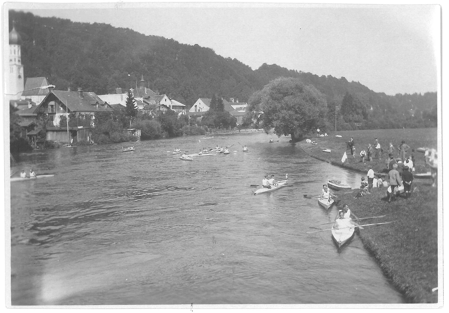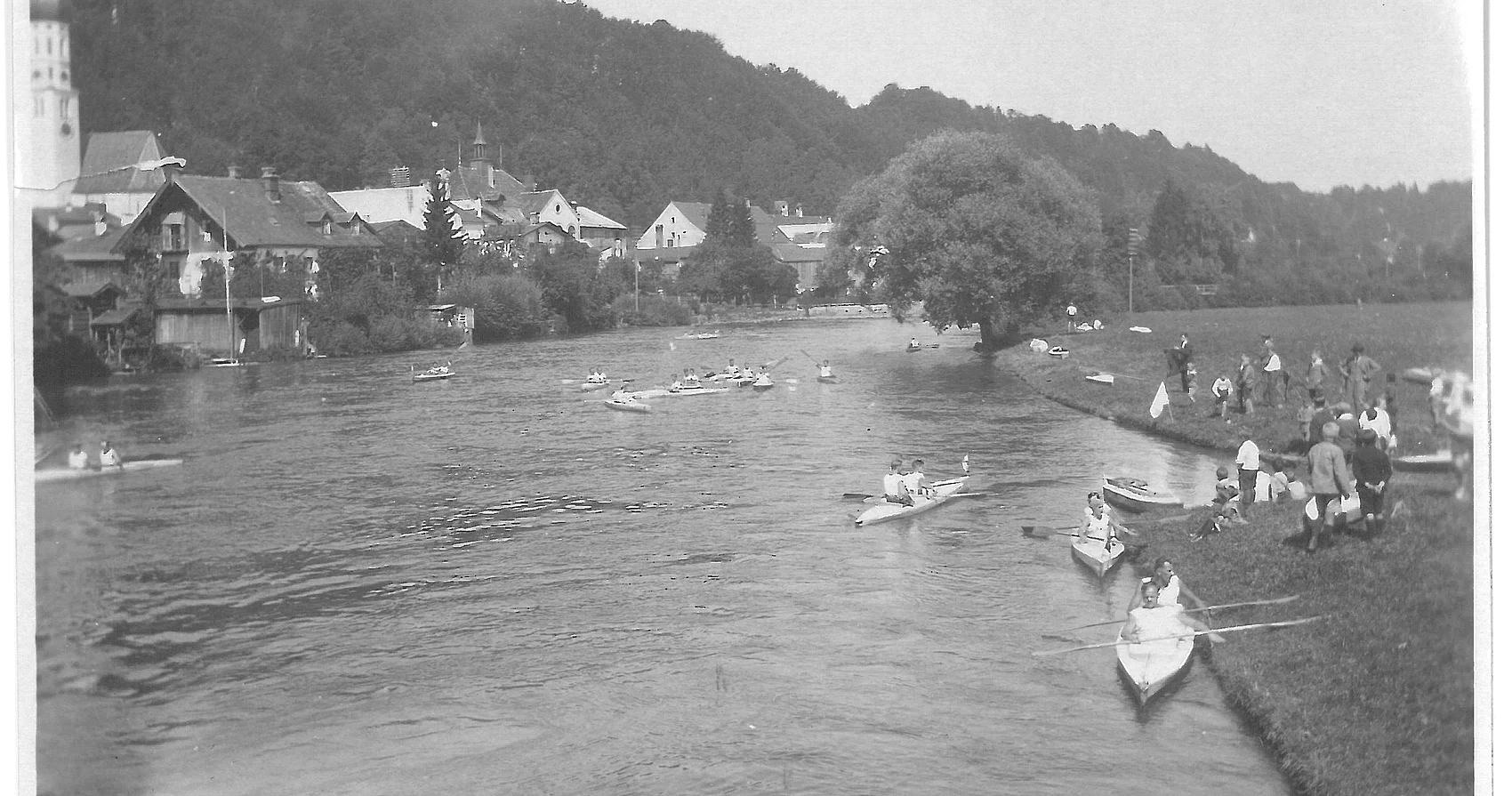 Dieses Bild entstand vor fast 100 Jahren an der Alten Floßlände. Leider gibt es zu dem Foto aus der Bauereis-Sammlung keine weiteren Informationen. Möglicherweise stand diese Regatta in Zusammenhang mit dem 15jährigen Stiftungsfest des Deutschen Touring-Kajak-Clubs am 9. und 10. Juli 1927. Dieser Club war der älteste Faltboot-Verein der Welt. Hauptattraktion war eine von Faltbooten begleitete Floßfahrt auf der Isar von Bad Tölz bis München. Dabei kamen laut Zeitungsbericht immer wieder Faltbootfahrer dazu. Allerdings soll das Wetter sehr regnerisch gewesen sein.