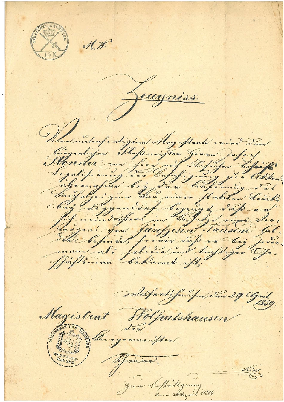 Außerdem befindet sich unter den Dokumenten ein Zeugnis für den Floßmeister Joseph Plonner. Der Magistrat und das Landgericht Wolfratshausen bestätigt darin, dass der Floßmeister befähigt und finanziell gut genug ausgestattet ist, den Warentransport für einen Brückenbau bei Deggendorf durchzuführen. Datiert ist das Zeugnis mit dem 29. bzw. dem 30 April 1859. (Landgericht April 1859)